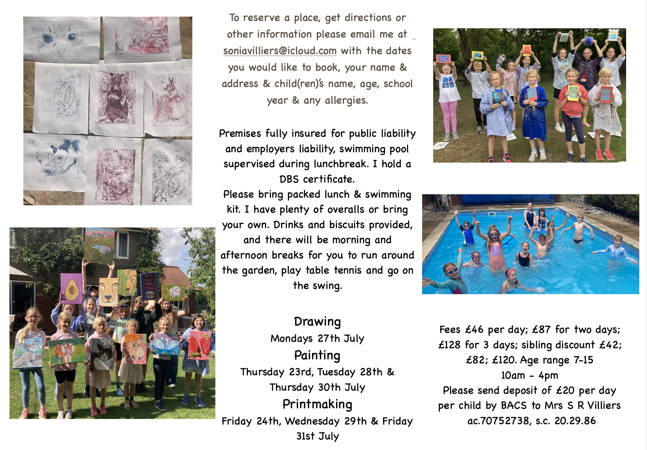 Please bring packed lunch & swimming kit. Swimming during lunchbreak with lifeguard present, water approx. 3'6" deep. I have plenty of overalls or bring your own. Drinks and biscuits provided, and there will be morning and afternoon breaks for you to run around the garden, play table tennis and go on the swing and tyre swing.